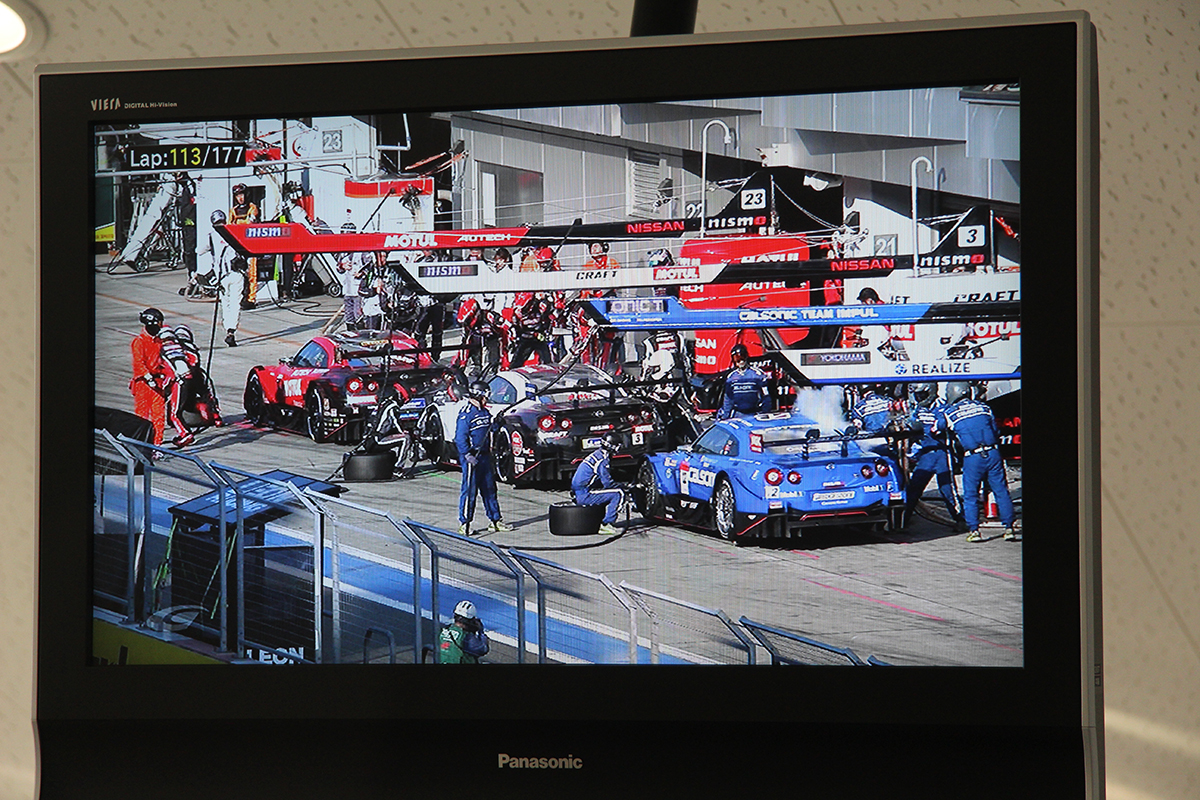 SC導入明けに一斉にピットインした各車。日産陣営では写真のようにピットが大混雑で、タイムロスも少なくなかった。この間に、優勝した6号車はSC導入の直前でピットインを済ませて悠々トップを奪ったのだった。