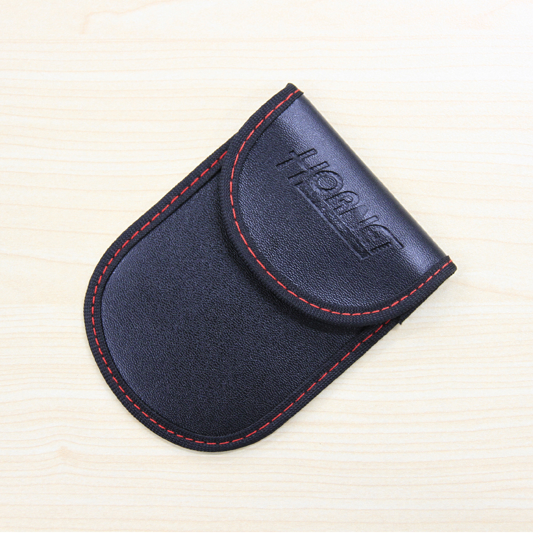 例えば、カーセキュリティで知られる加藤電機の「HORNETリレーアタック対策ケースRAC-1」は、持ちやすいサイズ感が特徴。黒革調ケースに赤ステッチを施し、表側にはHORNETロゴを型押ししたシンプルデザインで、他社製品よりもやや大きめなサイズ。ほとんどの電子キーとカードキーが収容可能となり、スマホ感覚で持ち運べるようになっています。