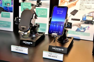パイオニアでは、ワイヤレス充電規格「Qi(チー)」に対応した車載充電器を2タイプ用意。ひとつは「SDA-SC510」というクレイドルだ。電動オートホールド機能を持っているのでスマートフォンを置くだけで光学センサーが反応して固定。さらにQiで充電もできるので、従来のようなケーブルをスマホに接続する手間も必要なし。もちろん、ロック解除は片手でワンタッチでできる。
