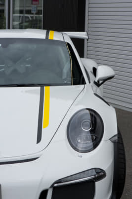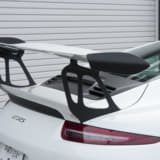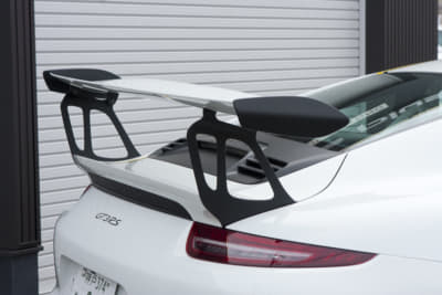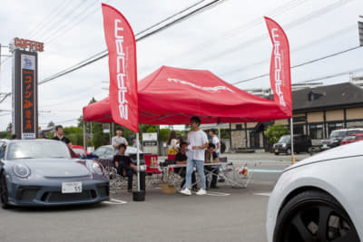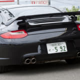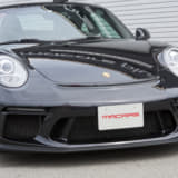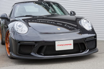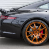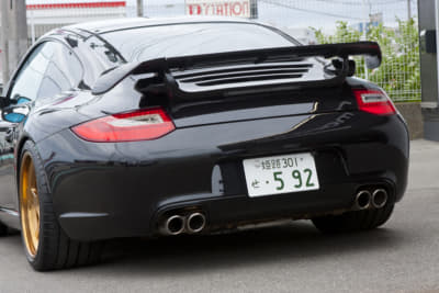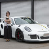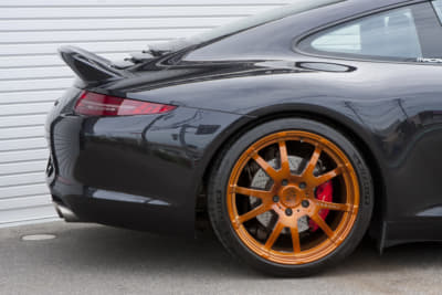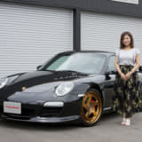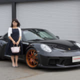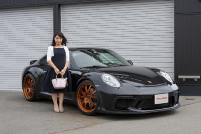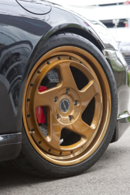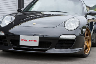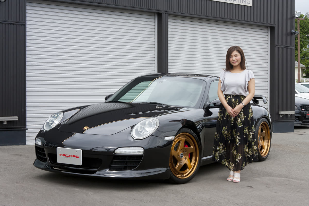 メイカーズ西尾代表のアシ車、ポルシェ997カレラS。ブラッシュドのカッパーカラーのホイールもさることながら、前期仕様から997の後期仕様へとフェイスコンバート。Fバンパー、デイライト、スポイラー、後期テール、Rバンパーが後期仕様へと見事にチェンジ。娘さんの舞サンが代理で登場。