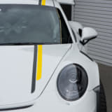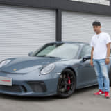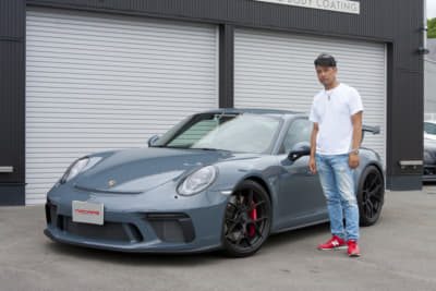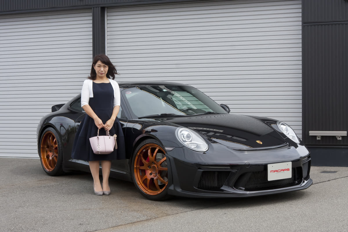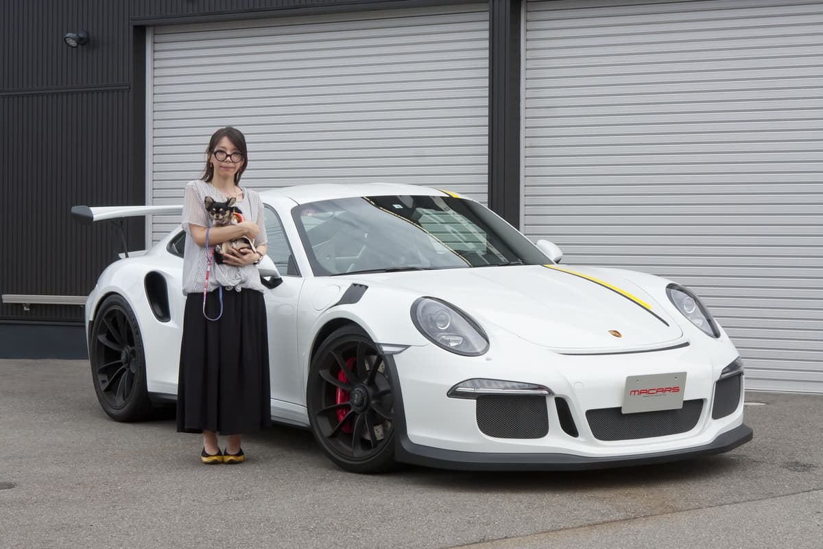 20+21インチの前後ホイールや巨大なエアロ、室内のロールケージも純正装着…という、純正で家一軒立ちそうなスーパーカーだけに純正の質感を超えるカスタムは中々難しいため、ボルシュタイナーのデモカーのラインをモチーフとしたラインをラッピングした程度でもこのオーラ。奧さんの恵里サンと愛犬カレラちゃんと。