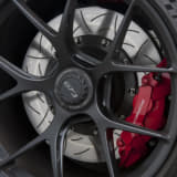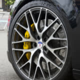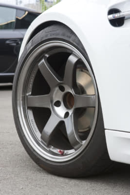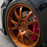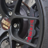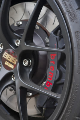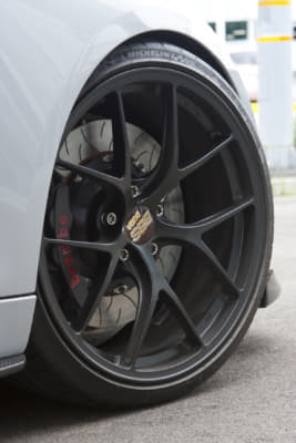 マットブラックのディスクにグロスブラックのリムという絶妙にフィニッシュを変えたホイールチョイスやブラックのボディに要所のアクセントとなる各種カーボンパーツ、さらにオレンジのキャリパーカバーを差し色とするなどシャレ心のある助永サン。後はメイカーズのローターキットを入れたらカンペキ、とか。