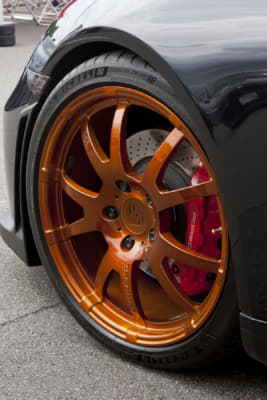 CSのフロントバンパーに、リアにも同じくダックテールを。さらにホイールを元々のペイントを剥離してブラッシュド・カッパーキャンディコートにカスタムフィニッシュ! このホイールのカラー変更はかなりインパクトありますね。今後はKWのHLS2のリフター付きに変更予定とか。