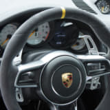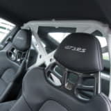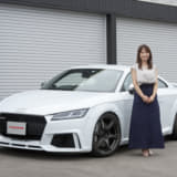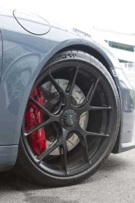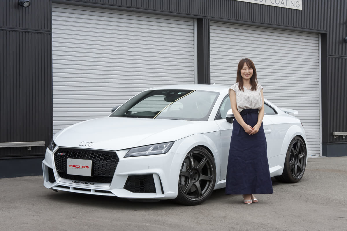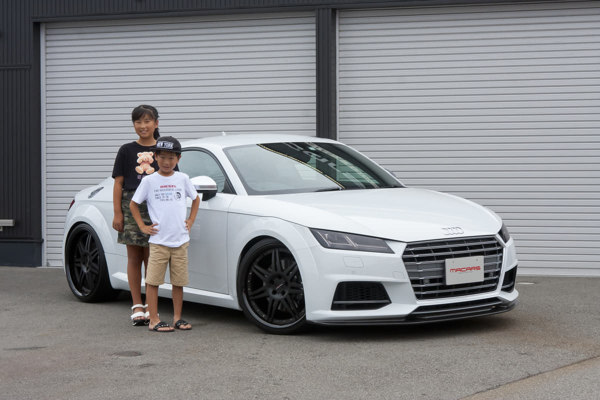 ホイールはレイズに特別に発注したこだわりの1セット。通常8.5のリム幅がなんと9.5へワイド化。色はこだわりのマットガンブラック。足回り以外は純正ですがTT-RSのパフォーマンスの高さを考えればいたずらなカスタムは不要かも。オーナー欠席のためメイカーズ社長夫人の華江子サンが代理で。