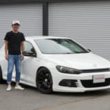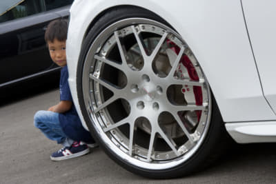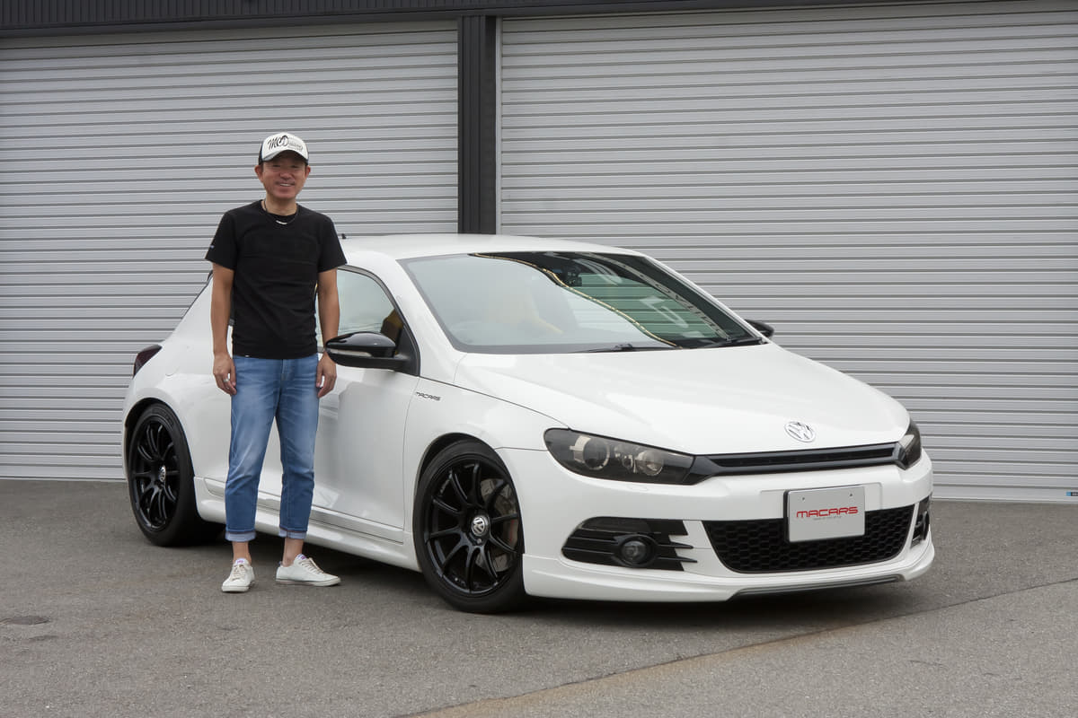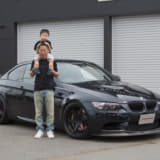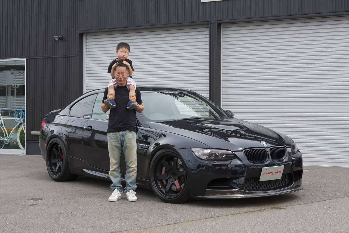 スペーサー無しで攻めたサイズを入れられるからとお気に入りのホイールはメイカーズのオリジナルバージョンのTE37。機能パーツも充実で、今後はロールケージをつけてメイカーズデモカーのポルシェのような2人乗り仕様でのスパルタンなルックスを目指すとか。お子さんの友規クンと。