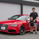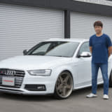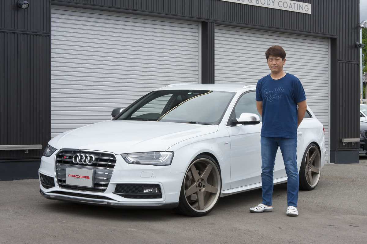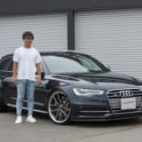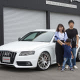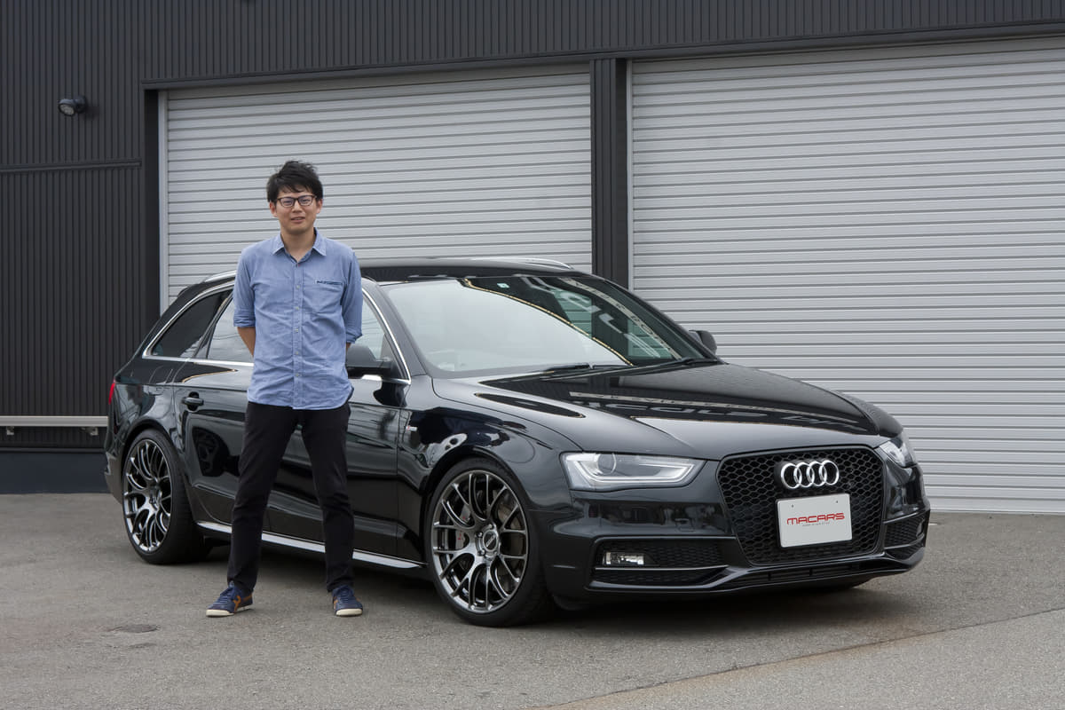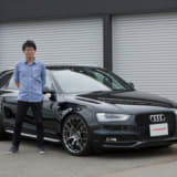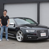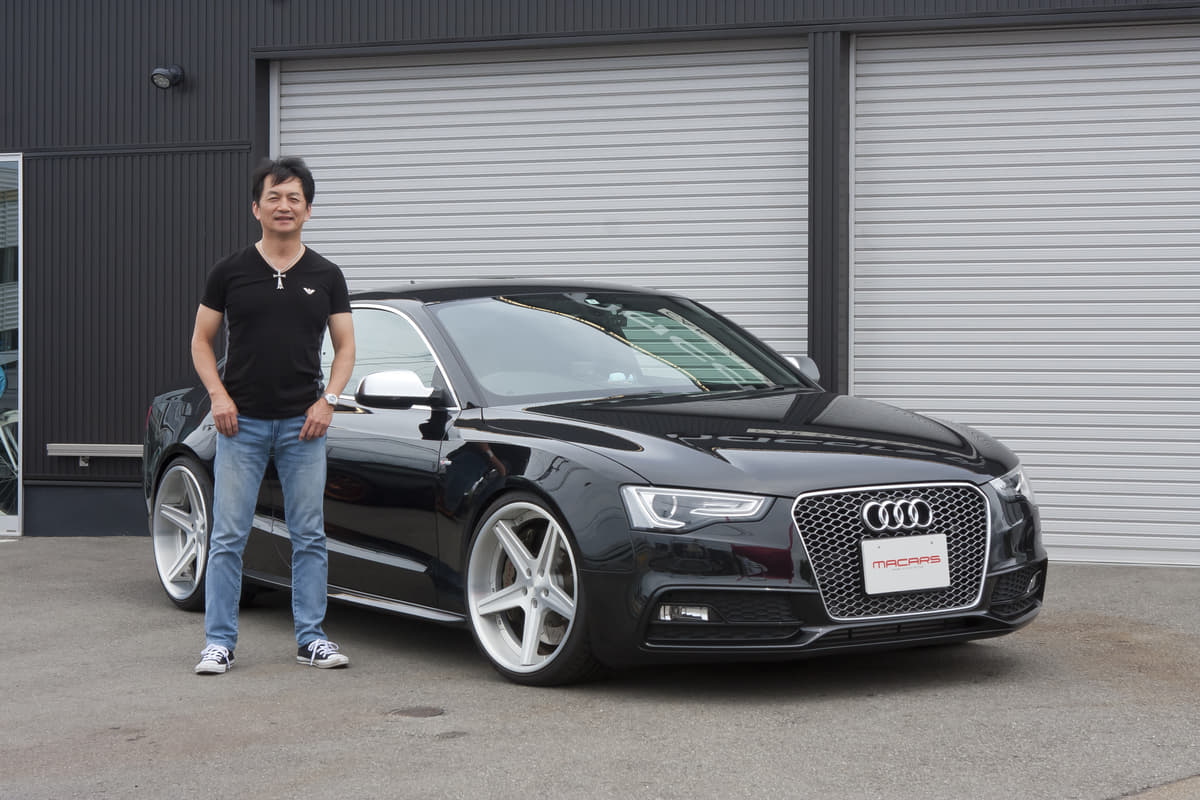 リップはよくあるカーボンではなく、敢えての艶ありピアノブラックをチョイス。シブいばかりじゃなく敢えておしゃれさを狙ったんだとか。派手にならずにオシャレに乗りたいと各部をブラッシュアップした大人仕様が好印象。オーナー欠席のため、A5に乗っているという息子の勝成サンが代理で登場。