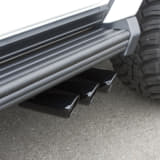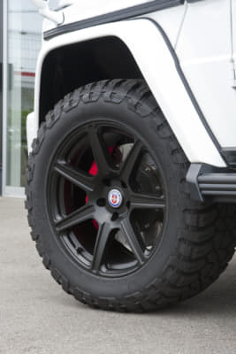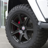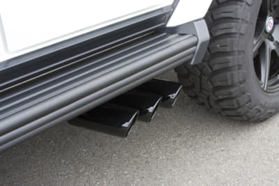 マットブラックのHRE・20インチ+ゴツいブロックタイヤを、40mmスペーサーによりリフトアップで実現した片芝サン。3連のサイドマフラーのグロスブラック仕上げ、ヘッドライトのインナーや背面タイヤケース、エンブレムなどをツヤありとマットの2種類で強弱つけて使いこなしたのもサスガです!