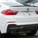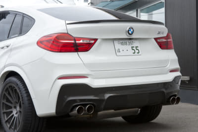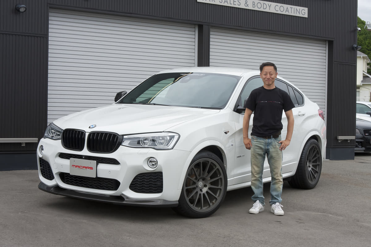 「ファミリーカーなので使い勝手が悪くならないようにカスタムしています」という光森サンのX4。これまでもメイカーズで4台くらいクルマを購入している常連さんです。マフラーはX4・3.5ℓ用をフランジ溶接して口径を変えた加工仕様。次はルーフにカーボンラッピングの予定とか。