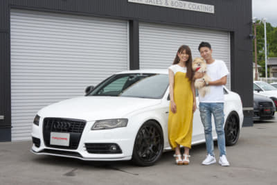 奥さんの真衣サンとポメラニアンのルイ君が一緒に登場。ルイ君の服はメイカーズオリジナルで世界に1着のワンオフ品とか。愛車のA4はと言うと、要所を押さえた仕様ながら、次は6.4万キロ走行・10年落ちの愛車のメンテナンスとトランクスポイラーの装着が希望らしいですヨ。
