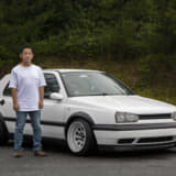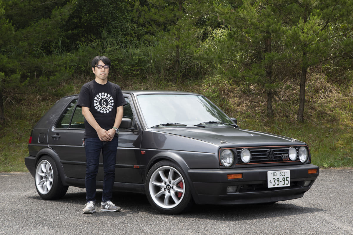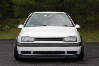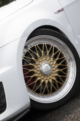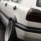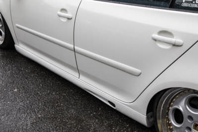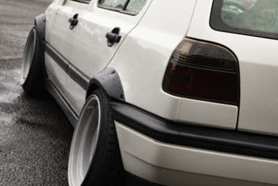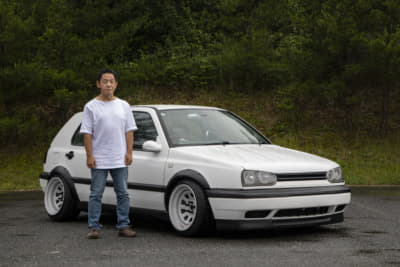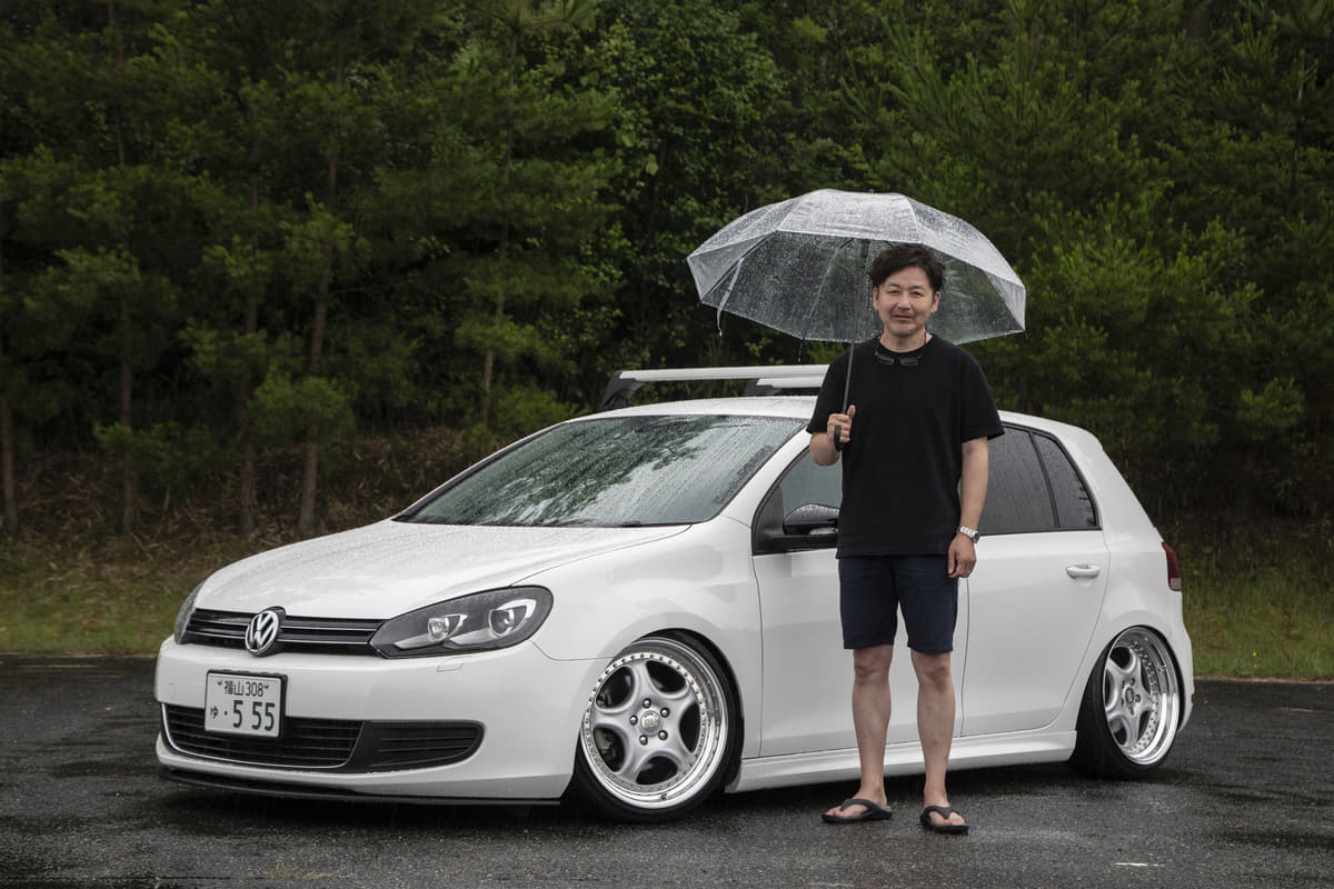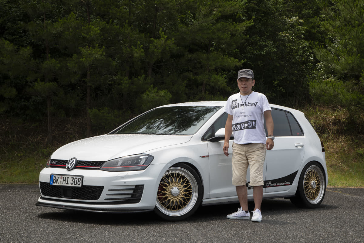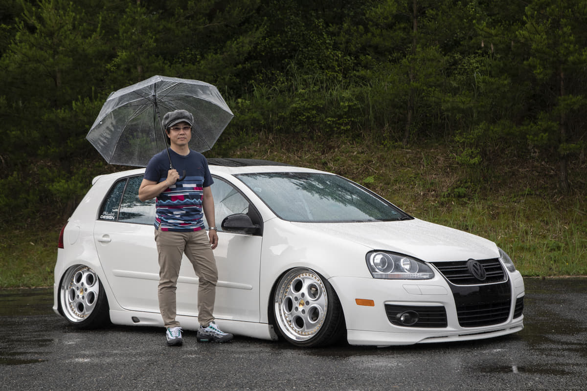 純正っぽさを重視している坂元サンは、フロントにスプリッタータイプのリップ、リアはGTI純正バンパーでライトにイメチェンしています。とはいえホイールは段付きリムでかなりの低さ。足もとに視線が行くようになってますね。つぎはエアサス化だそうで、さらにボディとのギャップが楽しめそう。