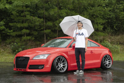 フロントにまでキャンバーをつけてワイドホイールを押し込んでしまった畝田サン。超タイトなマッチングが見事ですね。コンピュータチューンもすでに実施済みでTTの楽しさを満喫しているようです。今後は純正US仕様パーツやホイール交換を考え中だそうで、まだまだ変わりそうですね。