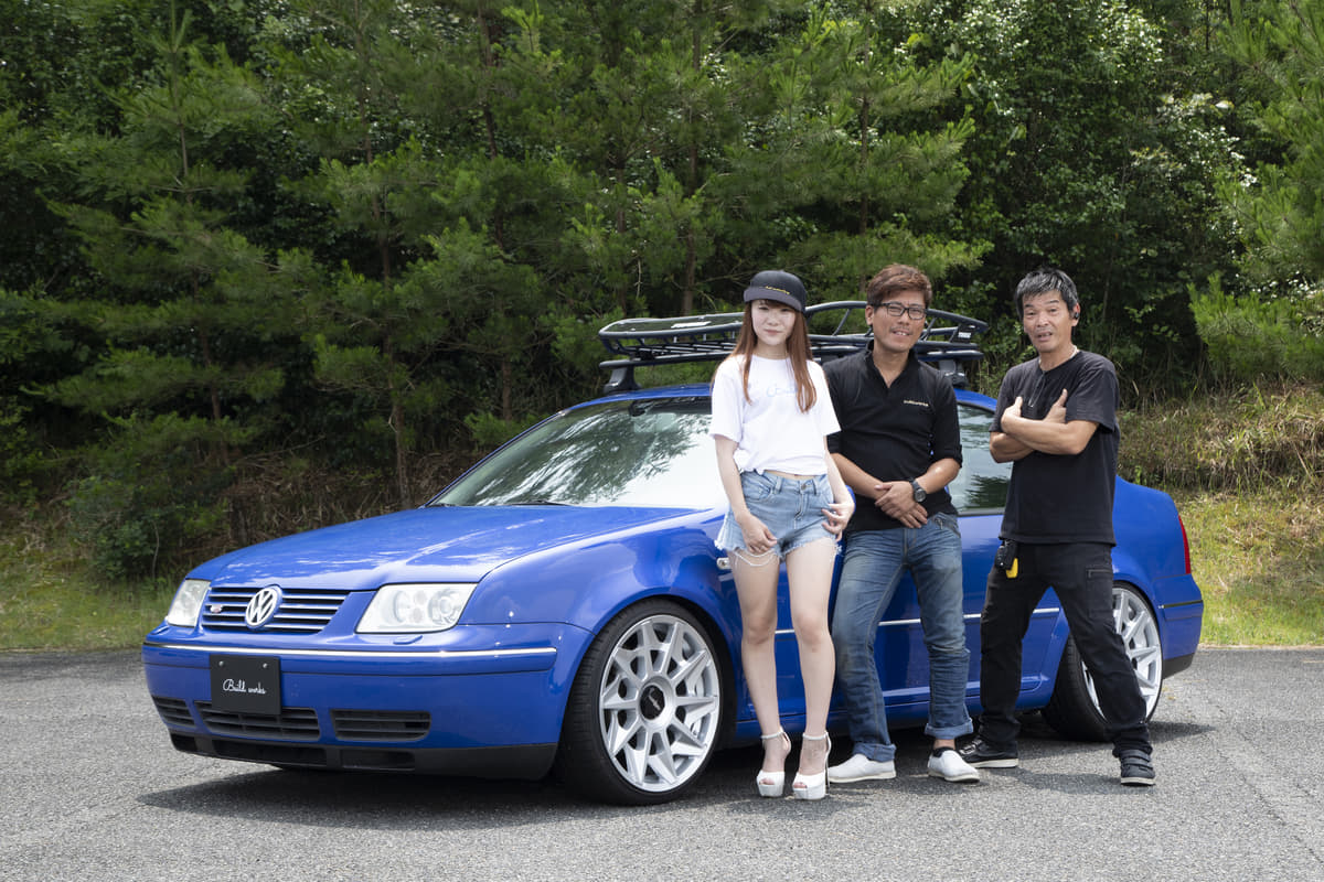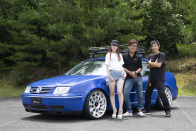 ビルドのキャンギャルさんと塩飽代表、そして久々の誌面登場となるユーロステージ今本代表という壮観な顔ぶれ。このボーラはビルドのデモカーのひとつですが、こちらは気軽に便利でオシャレなスタイルアップを、というコンセプト。コンパクトなセダンにロティとスーリーというコーデが小粋で楽しそうですよね。