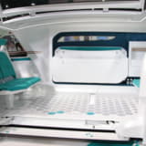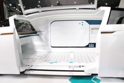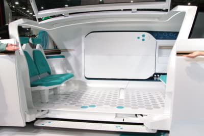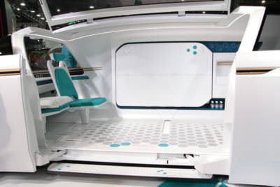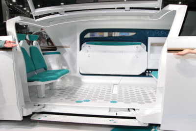 「トヨタ車体」が出品した、2030年のミニバンを想定した『PMCVコンセプト』は、完全自動運転とマニュアル運転の両モードに対応しながら、車体前方へ格納できる1列目は前後回転を可能に。また、車体右側への格納できる2列目はそのまま展開し縦方向に配置するのに加え、通常のミニバンのように1列目および3列目と平行に配置することも可能としている。3列目は車体後方より展開・格納できる仕組みだ。