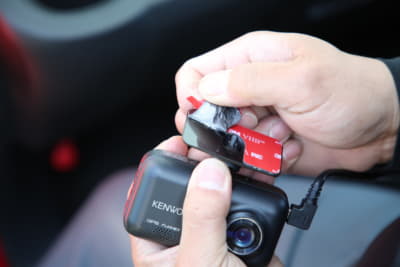 ドライブレコーダーのフロントカメラを固定するための両面テープは粘着力が低く、夏場の炎天下で車内温度が高まると落下してしまうことがある。ちなみに台座からキレイに剥がれる両面テープは粘着力が弱いタイプで、いずれ落下する可能性が高いとのこと。強力な両面テープは、剥がそうとすると台座部に粘着面が残り、テープ自体が破壊(中間層がボロボロになる)するそうだ。