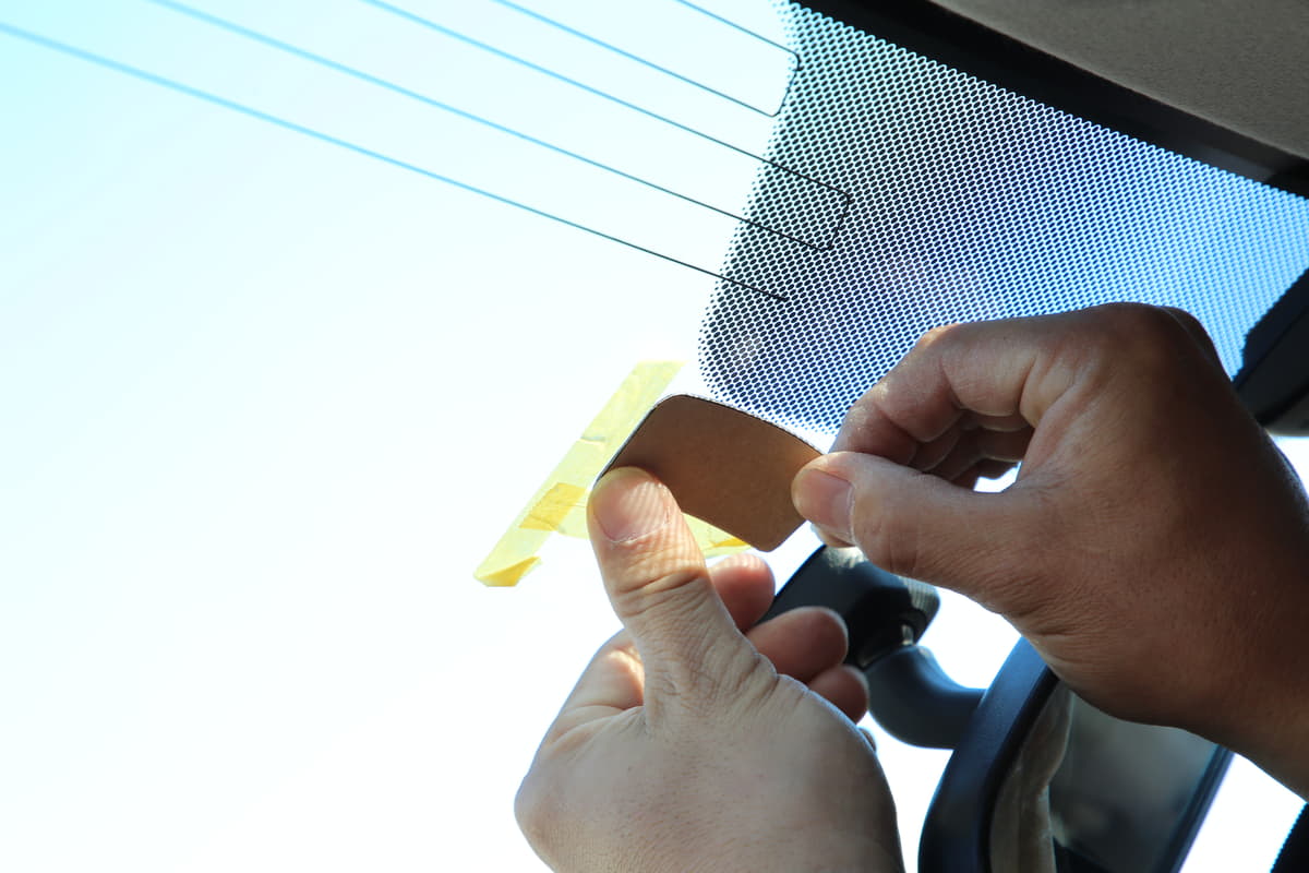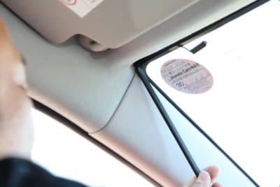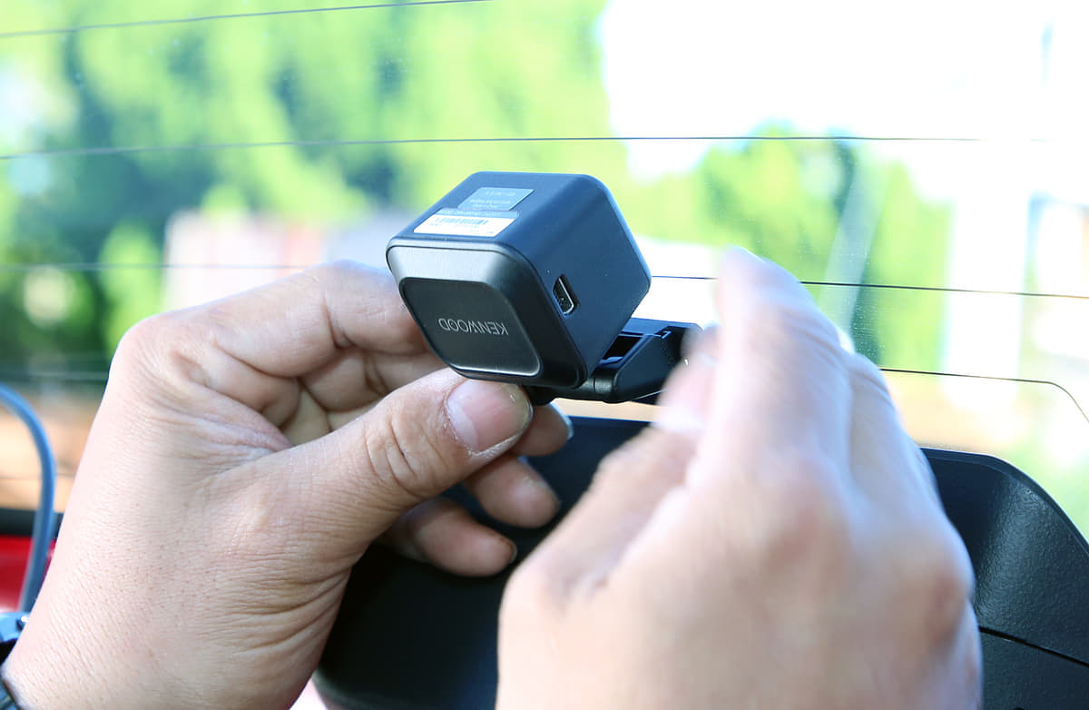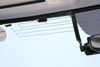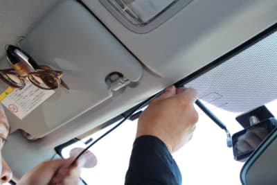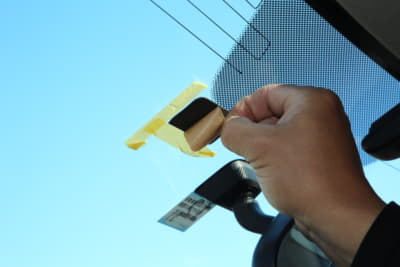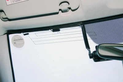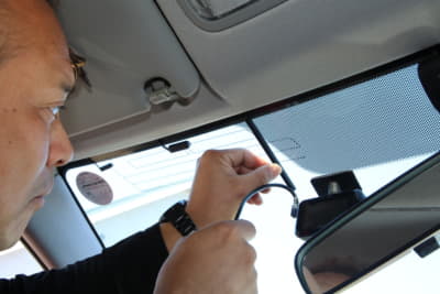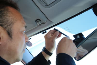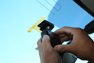 フロントウインドウ上部20%以内で装着位置を決め、マスキングテープなどでマーキング。フィットの場合はウインドウの黒いドット部が平坦だったが、車種によっては凸凹で粘着力が確保できないケースもある。また、モニターを常時点灯にすると夜間は眩しく感じる。今回は運転席から見てルームミラー裏になるようにして対応した。