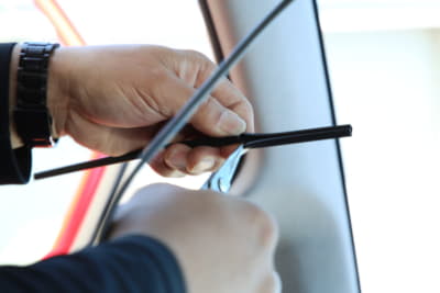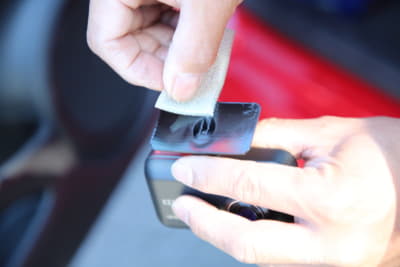 ここでポイントなのが、事前に付属のガラスクリーナーで汚れを除去したら、両面テープを先にガラス面に付けることだ。シッカリと押し付けることで気泡が入らない。
