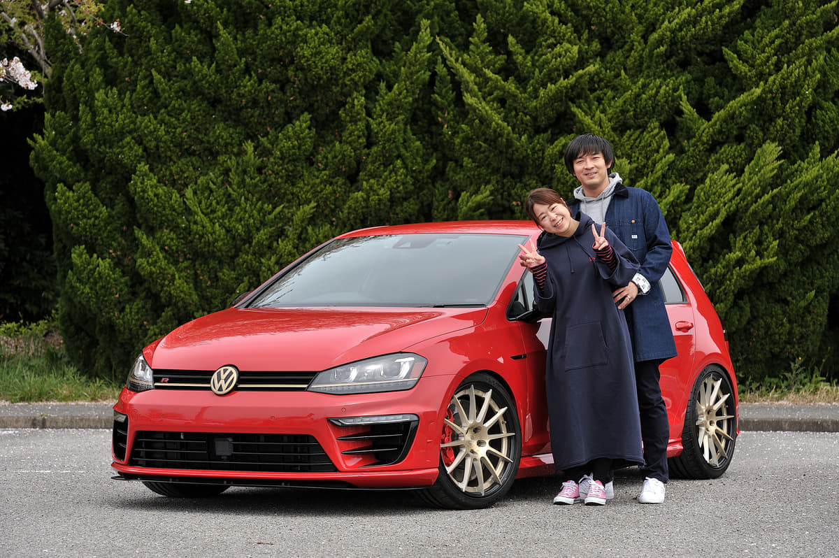 赤いゴルフ5でスタイルアップを楽しんでいた浅利サン。9年乗って、2年前にこの7Rに乗り換えました。差し色のゴールドが効果的に活きていますね。見過ごしちゃいけないのがフロントバンパー。なんとポルシェ・マカンの純正ダクトとデイライトをまるごと移植した力作なんです。さらにリアのアンダー部分は7.5R用の純正バンパーを加工してリフレクターを追加。アイデアがてんこ盛りなのにヤリ過ぎ感ゼロなところがベテランの貫禄です。同じメーカーや他メーカーの純正パーツを効果的に活用したことでクオリティーアップを図る。それが浅利サンの狙い。質感を上げることを重視して、ヤッた感は徹底的に排除しています。シンプルを極限まで追求したスタイル。まるで純正モデルの限定特別仕様のような存在感。そんなスタイリングにゴールドの差し色がメリハリを付けています。亜紀サンと一緒に。