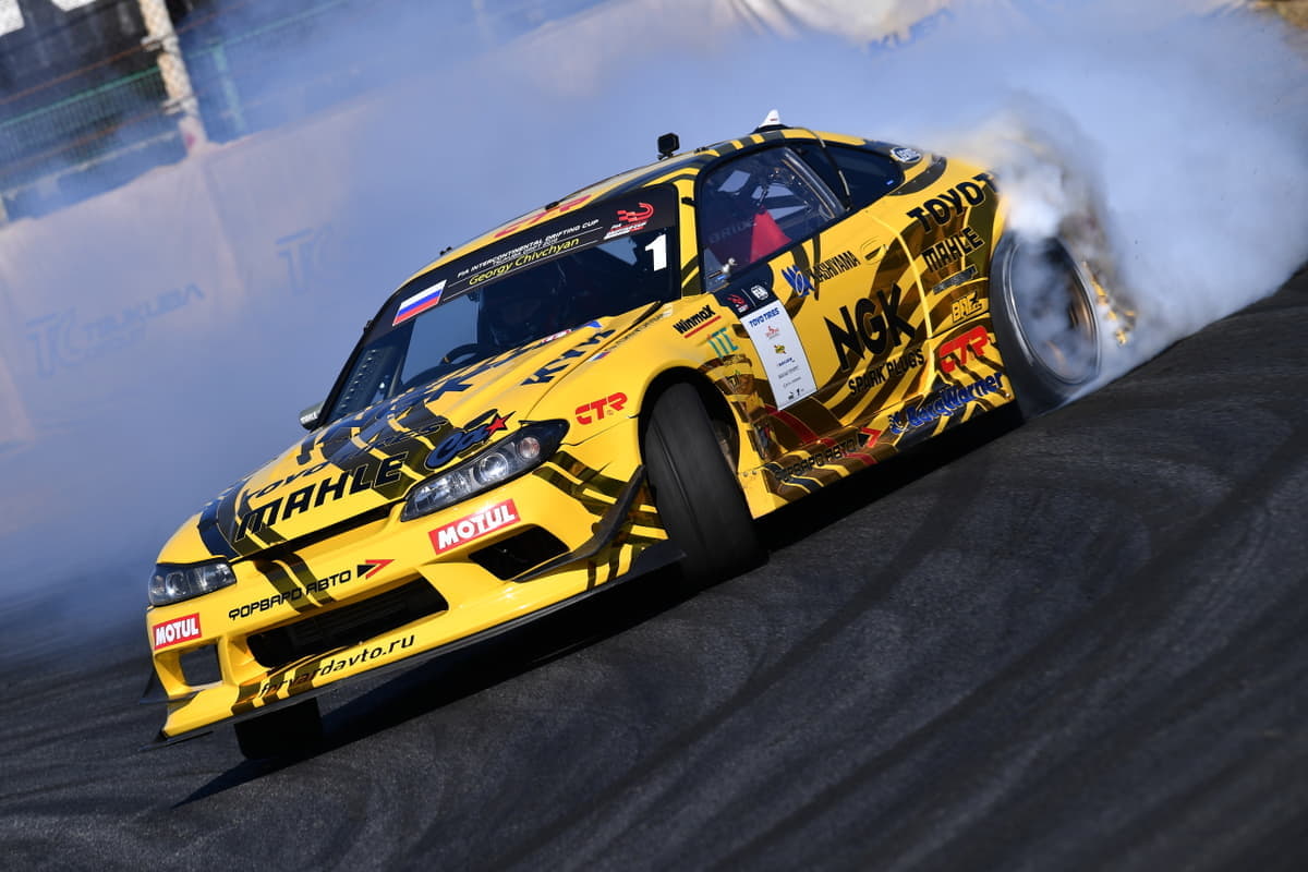 昨年優勝し、今回は唯一ロシアからの参戦となったゲオルギィ・チフチャン選手(#1 Russian Drift Series Team/日産S15シルビア)が、一本目の単走で84点を出して暫定トップに。