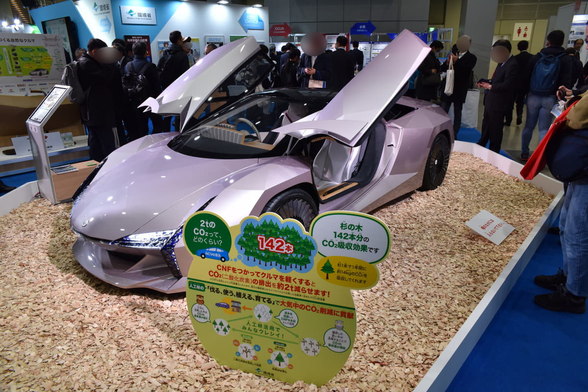 このクルマは、環境省の「セルロース・ナノ・ファイバー(CNF)等の次世代素材活用推進事業」の4年間のプロジェクトの集大成として作られたもので、軽く強くカーボンニュートラルな素材の特徴を生かす2シーター・スポーツカー。内外装の樹脂素材やリアガラスの代替材料として採用し、車両全体で10%以上の軽量化を達成している。