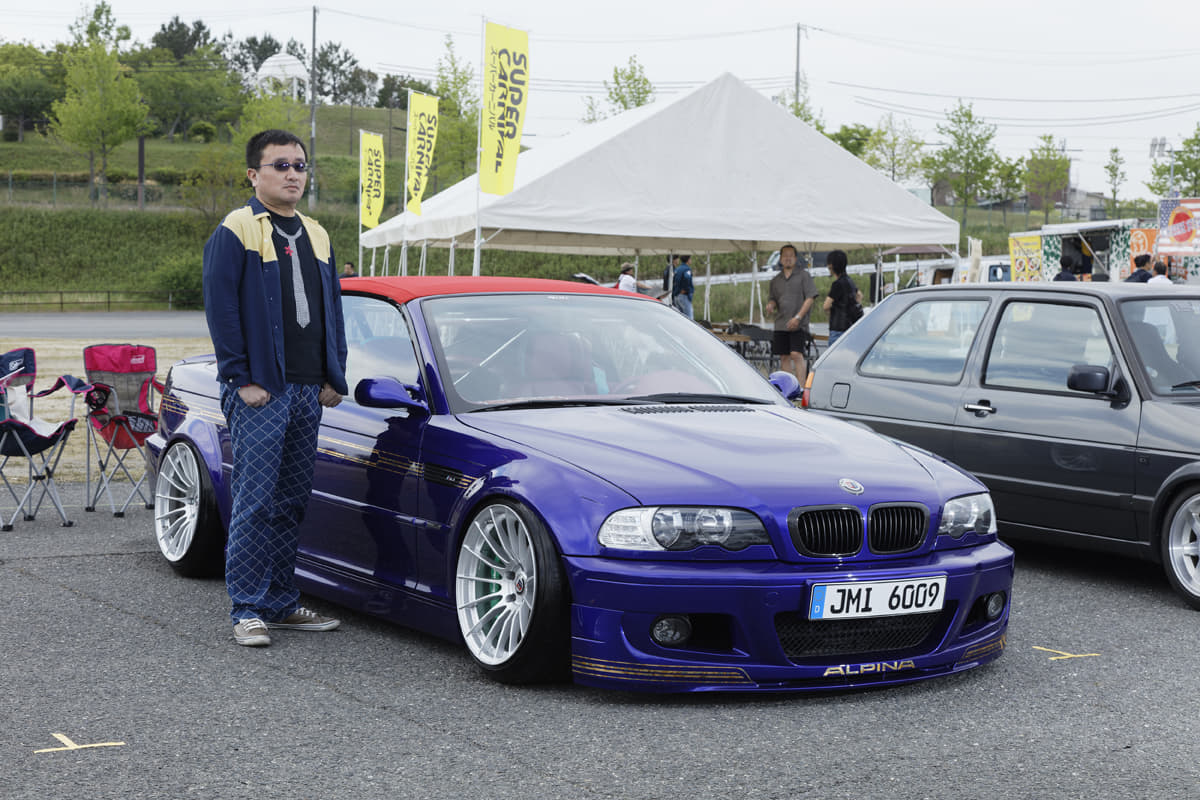 アルピナをイメージさせるボディカラーは、ロレックスのサブマリーナやiPhoneの海外現定色から着想を得た完全オリジナル。デコラインは焼き付けた金箔を貼ったゴールドリーフだったり、特注で染め上げたレザーを張え替えに使っていたり、超豪華なモディファイが随所に施されています。コンセプトは「M社とアルピナがコラボしてアーティスティックなE46 M3を作ったなら」。そこに元VIP乗りの感性を注ぎ込んだ剛田サンが、見事ナンバー2獲得です。車内はワインパープルとエメラルドグリーンをバランスよく配色。レザーのパンチングも特注し、ステッチの色を変え、アクセントを加えている。ワンオフのロールバーばかりに目が行きがちだが、実はさりげなく2シーター化されています。18インチに8POTキャリパーを合わせるなど、外装のアイテム構成も抜かりなしです。