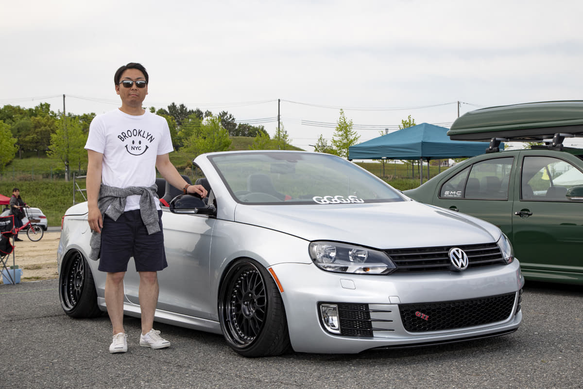ありそうでなかったイオスのゴルフ6フェイス。つまり日本で正規販売されなかった後期型イオスルックです。それもホンモノには存在しない架空のイオスGTIという二段構えのアプローチで楽しませてくれます。さらにエンジンかさ上げとこだわりの車高調でつくりだした超ロワードフォルムとブラックホイールの組み合わせも独特の雰囲気。内装はこれからですが、USマーカーとリンクしたUSブランドシートなどを見ると、こちらもかなり期待がもてそうですね。ホイールはディスクがマット、リムがグロスのブラックとして微妙に変化をつけています。フェイススワップの中で特に凝っているのがフロントバンパーで、上部は後期イオス、下部はゴルフ6GTI純正品を使って合体。ボンネット裏は吸音材を取り去り、エンジンを25ミリかさ上げした分のスペースをなんとか稼いでいます。
