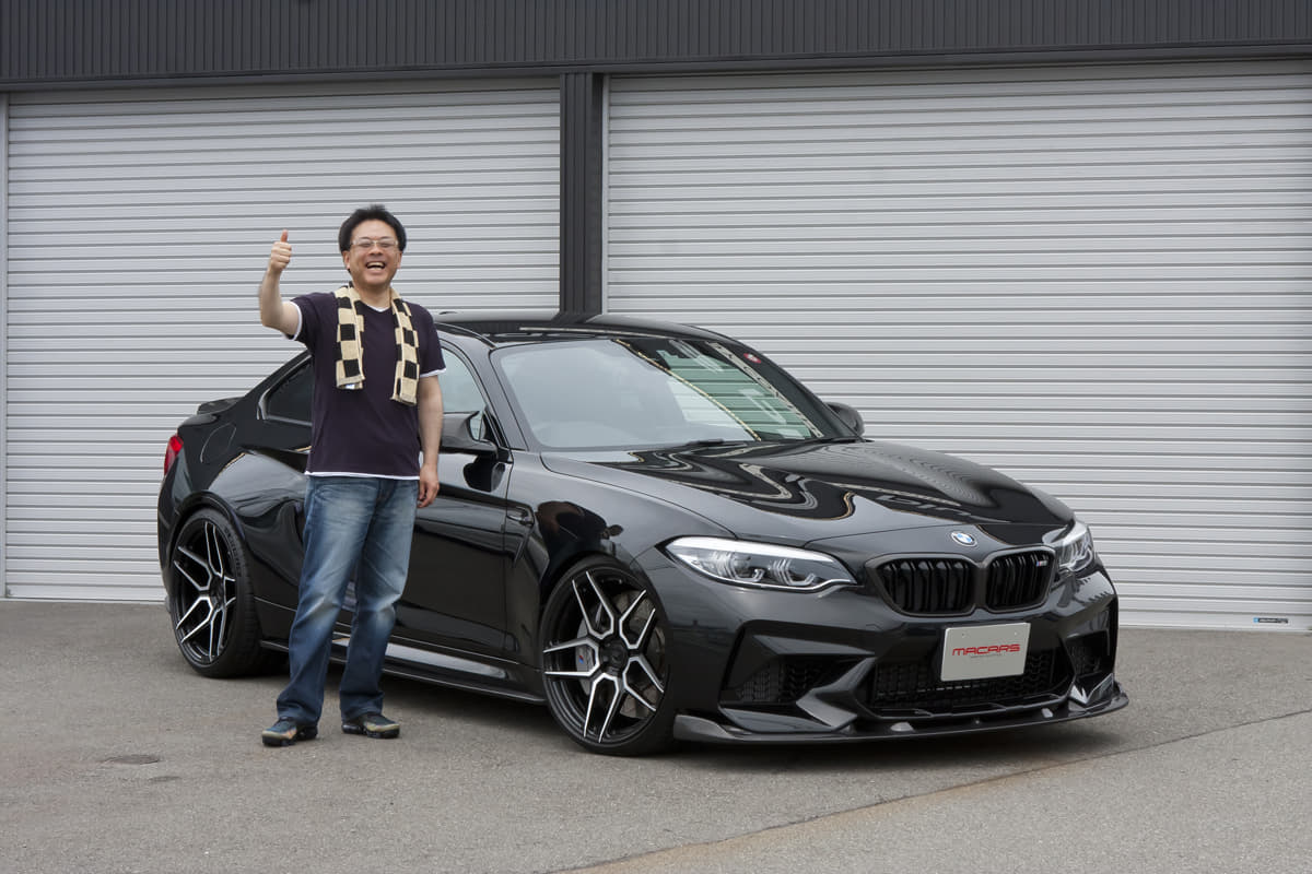 ここまでやっていながら「営業車なのでシートは変えられないんです」ってコメントもお茶目な池本サンのM2コンペ。カタマリ感のあるスパルタンなブラックシルエットからは見るからに速そうオーラをムンムンに感じます。注文済みのARMAのカーボンボンネットや、メイカーズオリジナルのECUチューンも今後は予定しており、馬力もノーマル410psからMAX580psまで叩き出そうかという勢い。大人ならではの仕事兼遊び車として注目です。BCフォージドのEH-309のこのダイヤモンドカットカラーはレアな存在。Mパフォーマンスのドアミラーカバーやカーボンキドニーグリル、サイドギルなどで外観を、arcのスタビやパワーブレース、CPMのメンバーブレースやロワレインフォースメントなどでボディ剛性の強化を図るなど走りに直結した機能美でも磨き上げています。