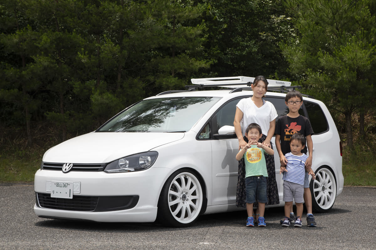 白×白のクリーンなシンプルさが逆にハッとさせるトゥーラン。ファミリーユースのための車高やレジャーに便利なルーフラックといった仕様は参考になりそうですね。それでもディテールを見ると、さりげないバッドフェイスと、延長したボンネットがエンブレムに干渉しないようエンブレムの角度を寝かせるといった技あり箇所が。ホイールがカールソンという点も、ちょっとしたサプライズですね。こうたクン、たいきクンたちと。バッドフェイスで伸ばしたボンネットが当たらないよう、角度を寝かせたエンブレムに感心。軽やかに見えるホワイトホイールがカールソンというのも意外。そんなギミックをもたせつつスマートでユースフルな仕上がりなのがこれまたいいですね。