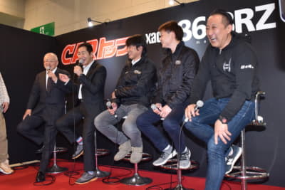 SUPER GTブースで開催されるドライバートークショーには、大嶋和也、高木真一、福住仁嶺、武藤英紀の現役GTドライバー4選手が登場しているのだが、大阪オートメッセ初日となる2月14日には、なんと坂東正明GTアソシエイション代表取締役社長が乱入した。