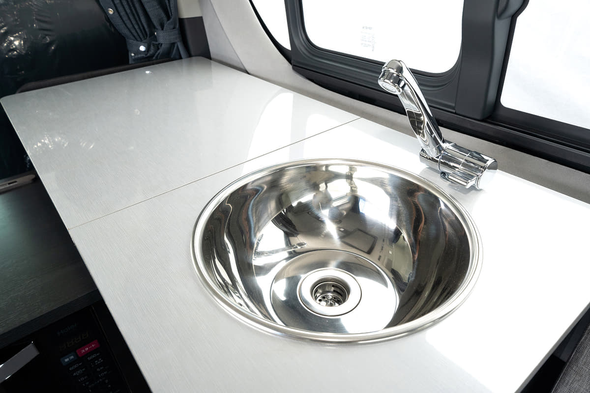 また、サイドのシート下にはセンターテーブル用のパイプを収納したりできる大型収納庫を完備。シンク下には給・排水タンクが収まっている。
