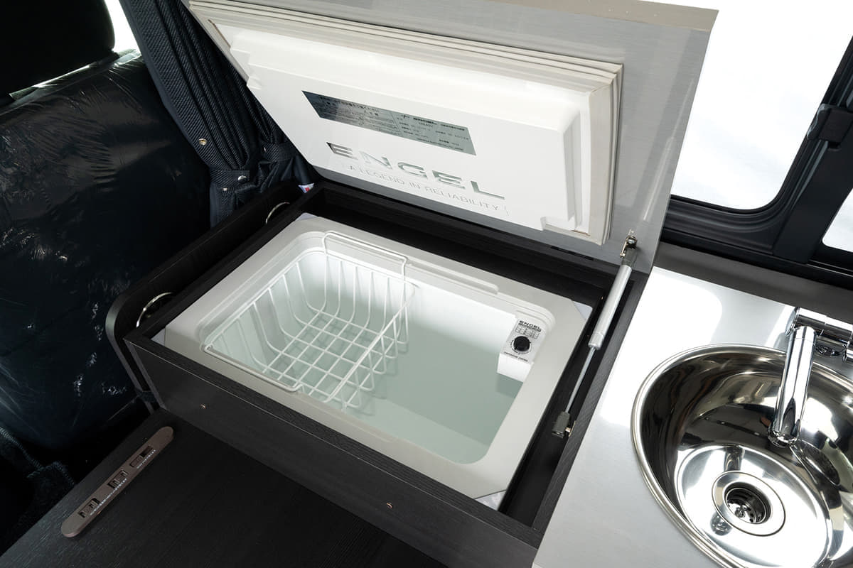 調理台の下には40Lのエンゲルの冷蔵庫を装備。家族や仲間とワイワイクルマで楽しむのに冷蔵庫があると非常に重宝する。