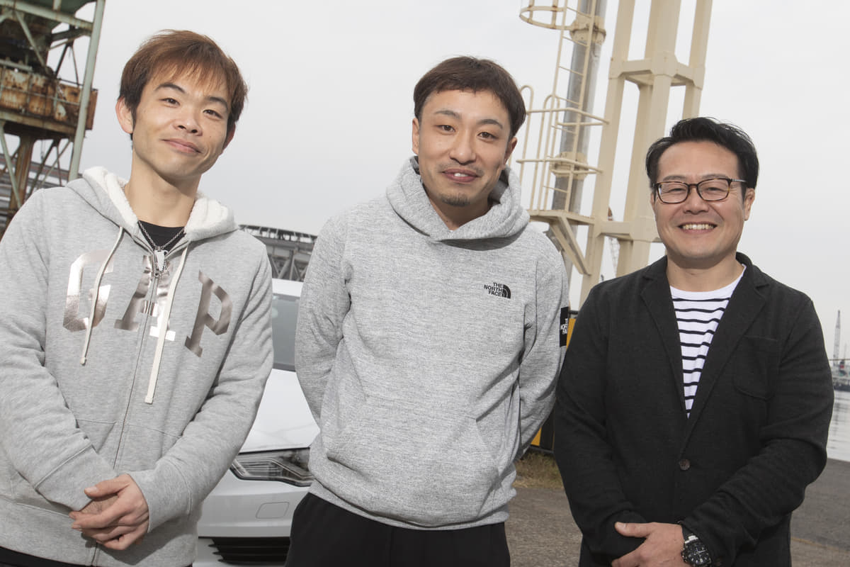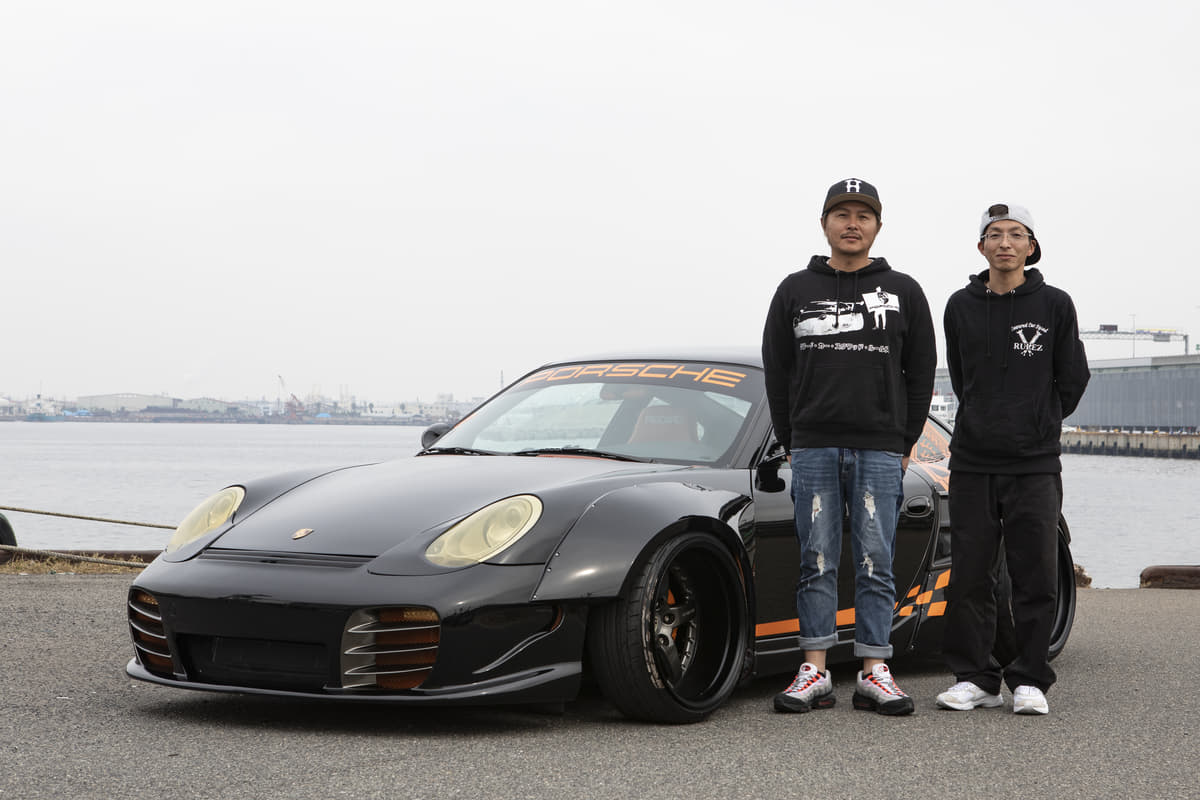 黒のTTにロハナのツイステッドスポーク。上出サンのキャラにマッチしたいい選択じゃないでしょうかね。さらに目を引いたのがエビ管マフラーで、ハンドメイドならではの主張がリアスタイルを盛り立ててます。とはいえまだまだ進化の途中で、バンパーや足回りも変えるというから楽しみです。一慶クンと。