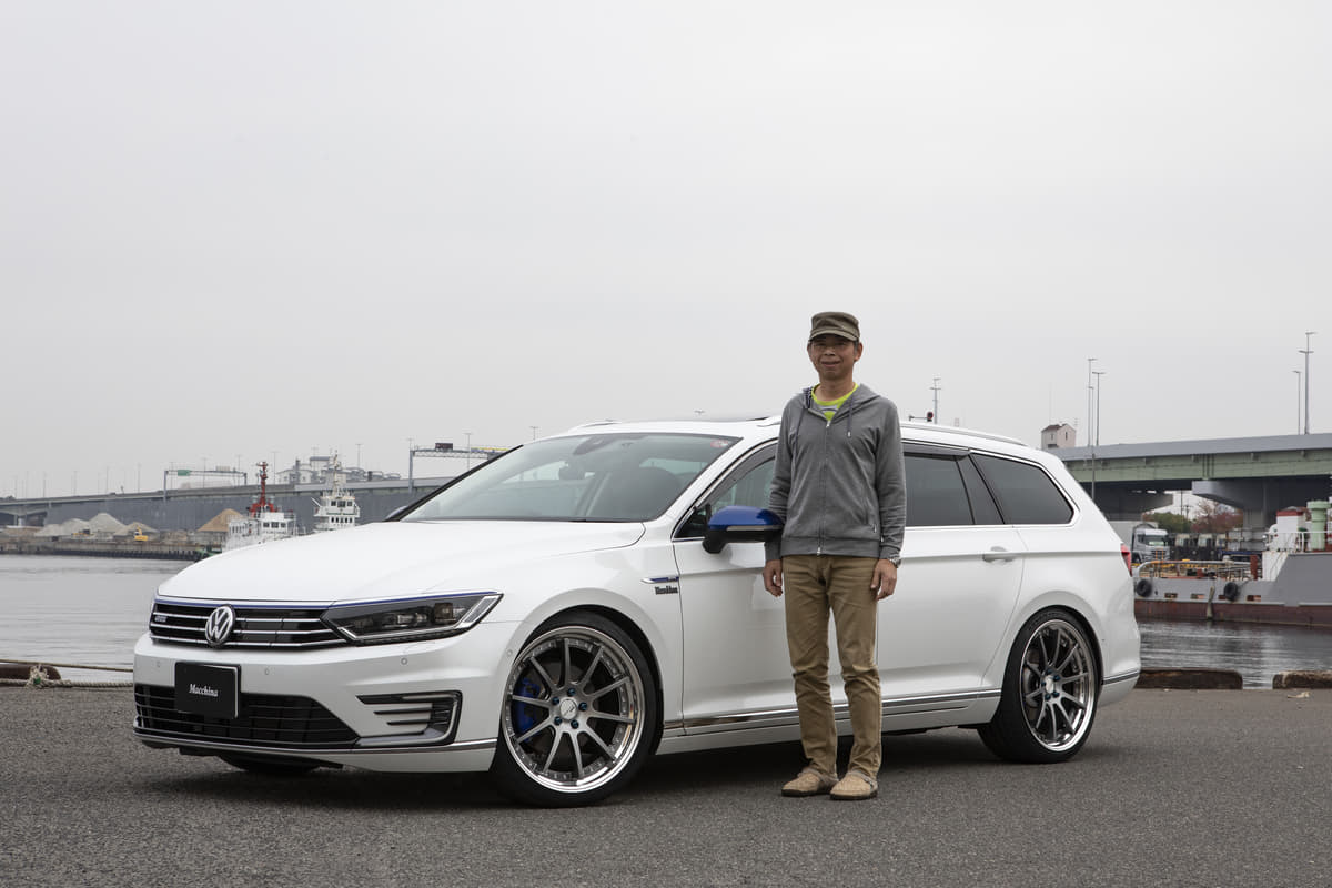 スタコンではまだめずらしいクルマ。VWのハイブリッドのシンボルカラー、ブルーをミラーやホイールボルトなど随所にあしらったシンプルスタイルが魅力です。リアワイパー跡のLED・VWマークやフットレストといった自作技を楽しんでいるのもいいですね。専用パーツは少ないですが、塗り・貼り技中心にチャレンジしていくそうです。