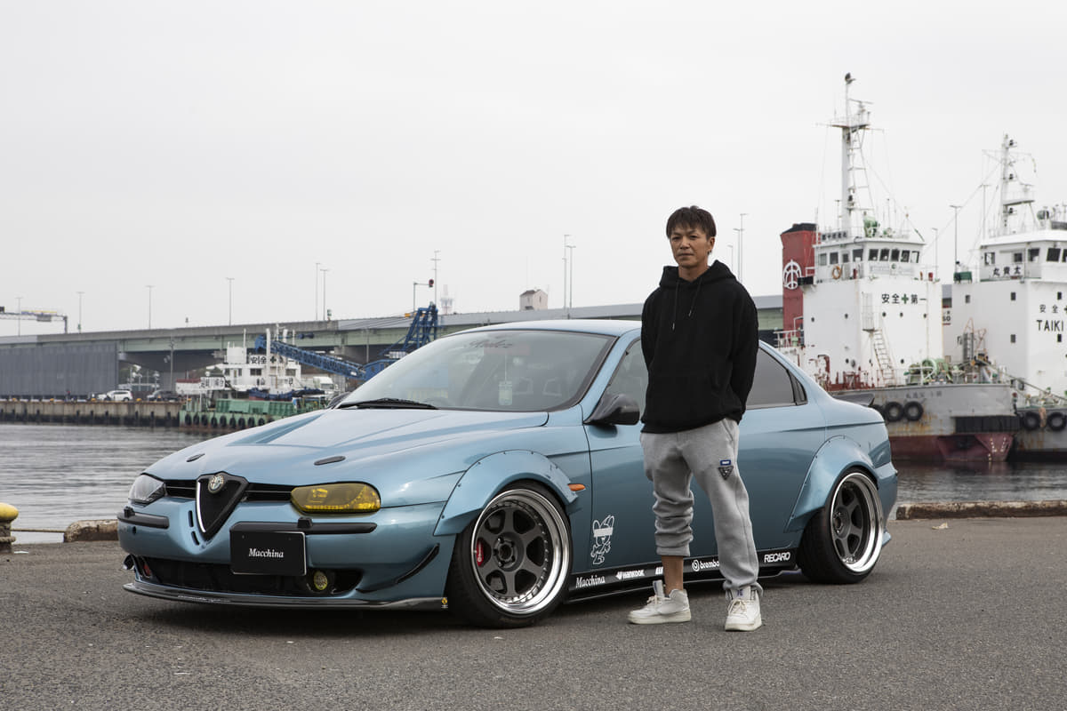 マッキナのメカニック、西坂サンも愛車を披露。シックなエクステリアと、本革の赤黒インテリアとのコントラストが印象的です。インパネやコンソールへの水圧転写もきれいにマッチしていて、いっそうエキゾチックに魅せているようですね。