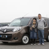 カングーにはめずらしいリップスポイラー装着、リアナンバーポケットやエンブレムのマットブラック化でジワリと引き締まった印象。インテリアもボディ色に合わせたマットでオシャレ感がグッとアップしています。カジュアルな中に大人っぽさも演出しているのがいいですよね。順哉サンと。