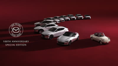 マツダは、創立100周年を記念する特別装備を採用した「100周年特別記念車」を、国内で販売する登録乗用車全車種(MAZDA2、MAZDA3、MAZDA6、CX-3、CX-30、CX-5、CX-8、ROADSTER、ROADSTER RF)に設定してリリースするという。4月3日より全国のマツダ販売店を通じて予約受注が開始されており、2021年3月末までの期間限定で販売される。