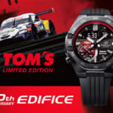 エディフィスは、2020年に発売20周年を迎え、モータースポーツファンに人気の高機能メタルウォッチのメンズ腕時計ブランドだ。一方のトムスといえば、1974年の創業以来、数々の実績を成し遂げてきたレーシングチーム。2019年は全日本スーパーフォーミュラ選手権では、所属ドライバーのニック・キャシディがチャンピオンを獲得するなど、日本のトップチームとして活躍。カシオは2013年から同チームのオフィシャルパートナーとなっている。