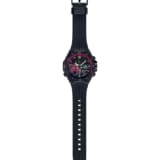 本体は黒を基調としながら、文字板の内周部分やインダイヤルにはトムスのロゴに用いられている赤富士をモチーフとした赤のグラデーションを採用。インダイヤルにはレーシングカーの「ブレーキキャリパー」をイメージし、”TOM’S”のロゴ入りブレーキキャリパーをデザインアクセントとしたほか、レーシングカーと親和性の高いカーボン素材を文字板に採用するなど、モータースポーツの世界観あふれたフェイスデザインに仕上げられている。
