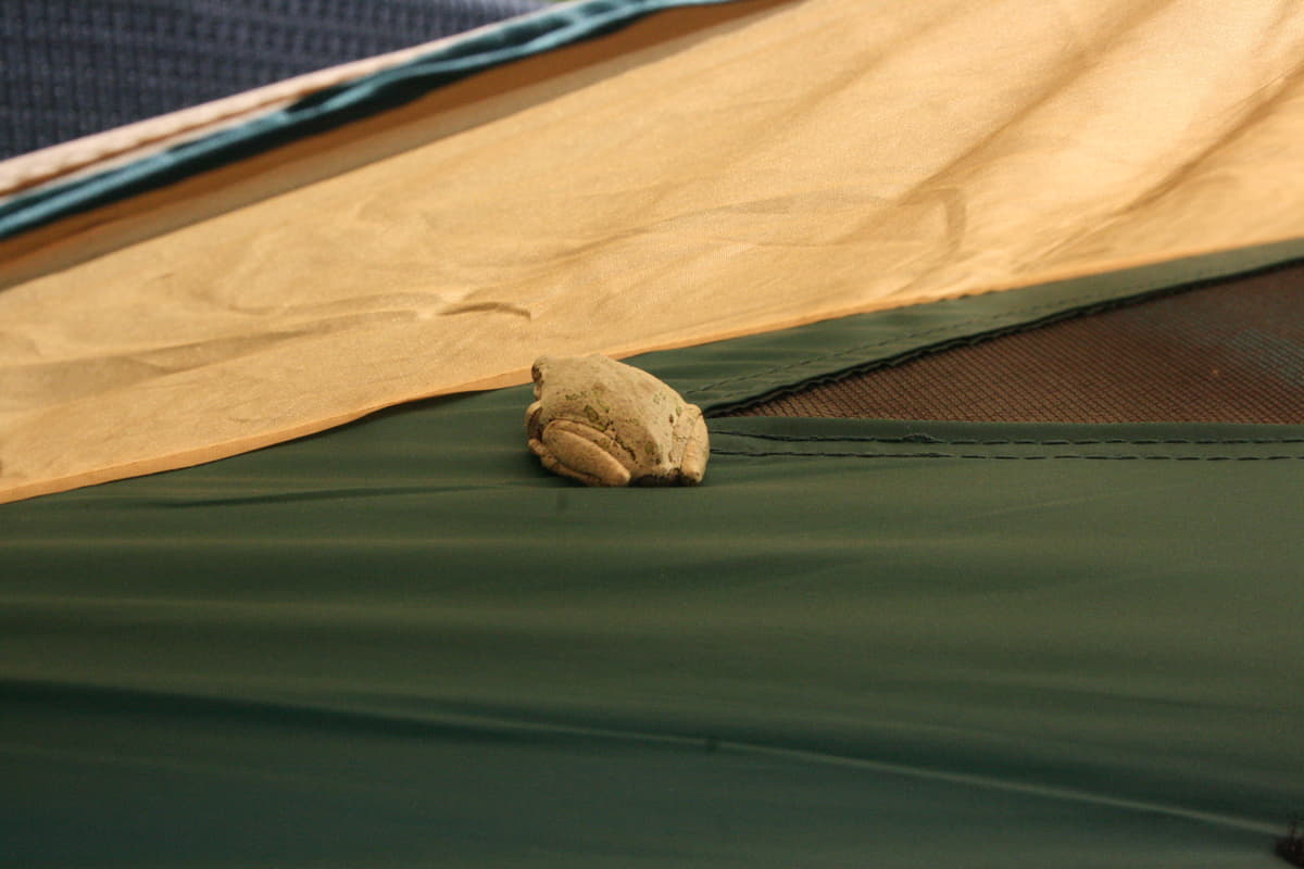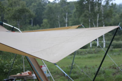 雨が降り続くと、タープやテントのキャノピーに雨水が溜まることがあります。そのままにしておくと、溜まった雨水の重みで倒れてしまうことも。