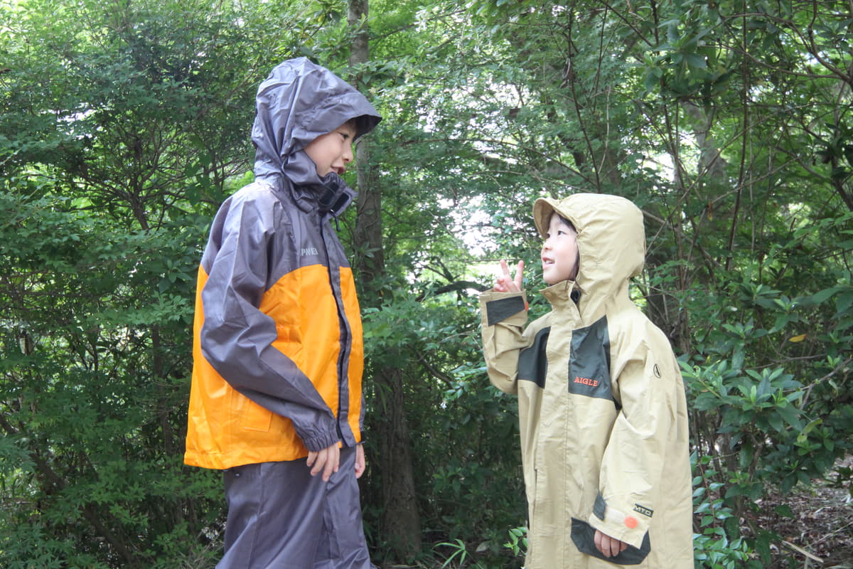 タープの下で遊ぶだけでは物足りない! そんなときはレインウエアを着て、キャンプ場内を探索しに行きましょう。雨が降る姿を見せるカエルやカタツムリを見ることができたり、雨になると花を閉じる野草があったり、キャンプ場内だけでも自然観察は楽しめます。
