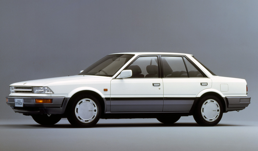 初代スタンザ・セダン(A10型)。写真はセダンの最上級グレード「マキシマ GT-E」前期型。マキシマの名前は、のちに派生して別車種に発展する。バイオレットとオースターにあった1.4リッターエンジン(A14型)は載らず、1.6リッター/1.8リッター(Z16/Z18型)が積まれた。