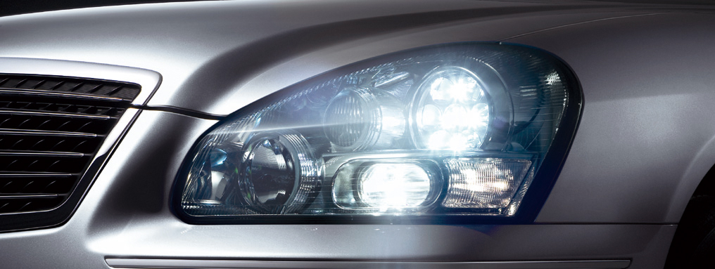 純正採用されるプロジェクターヘッドランプが多くなり、装備としての優位性が薄れてきた頃に登場したのがF50シーマに採用された個性的なプロジェクターヘッドランプ。通称「バルカン」と呼ばれた形状は、まさにバルカン砲のように並んだ7つのレンズが特徴となっている。