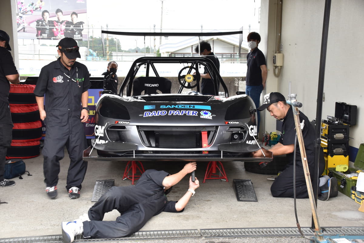 今回参戦するGLMのトミーカイラZZ(#230 2020年式 GLM Tommy Kaira ZZ )は、市販モデルの2台分となる36kWhのバッテリーを搭載する。基本的なボディサイズは市販モデルの全長3870×全幅1740×全高1140mmと変わらずで、それにエアロデバイスが装着されている、ということだ。市販車の車両重量は850㎏であったが、バッテリーを2台分積んでいるため、これを大きく上回る。ボディカウルやミラー、ダッシュボードに、セルロースナノファイバーを使用するなど、軽量化も進めている。