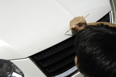 一般的に線傷を直す際は、傷を挟むようにマスキングテープを貼り、ボディ色と同じ色番号のタッチペンで傷に対して色を差していくような修復を行う。