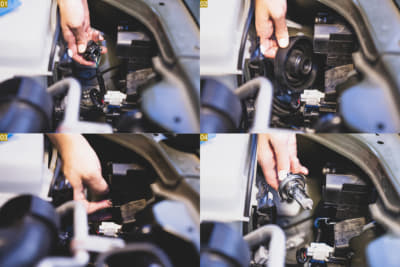まずは純正のヘッドライトバルブにつながっている配線のカプラーを抜き、防水用ゴムカバーを外す。そして純正ヘッドライトバルブを固定しているスプリングを外したら、バルブ本体が取り出せる。これが出来たら、全く逆の工程を繰り返して「プレシャス・レイZ」に付け替えるだけ。