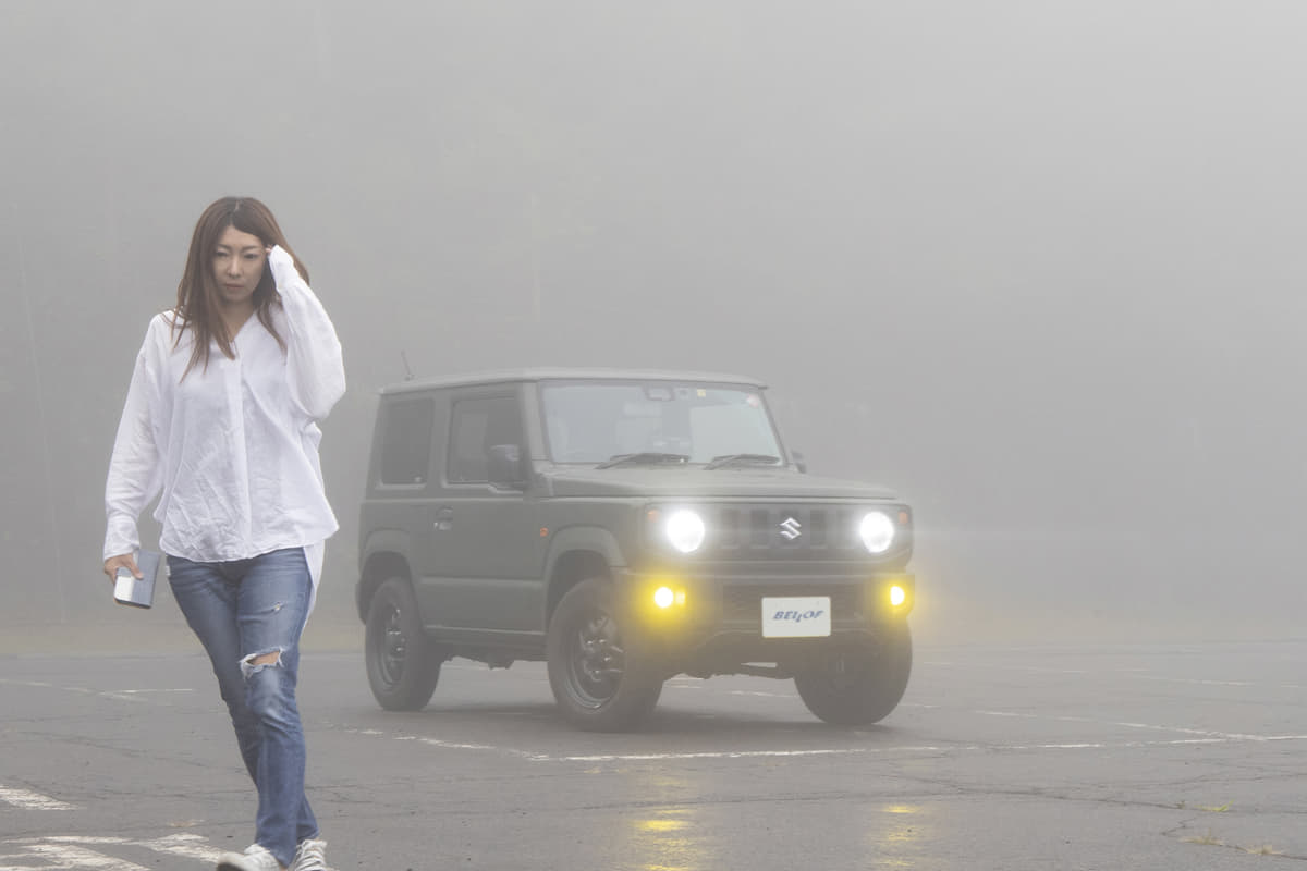 また、この小さなボディの内部に点灯ユニットや、冷却ファンもしっかり内蔵。LED発光時に生じる熱を高速ファンで風を当てて確実に冷却させることで、10000時間もの長寿命を実現。そして照射もご覧の通り。キャンプに行くと濃霧など突然の天候の変化で視界不良に遇う事も多いが、そんな天候であっても「プレシャス・レイZ」はしっかりと愛車の行く先を照らしてくれる。