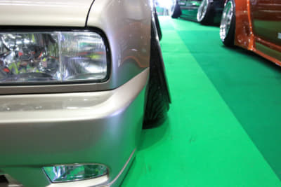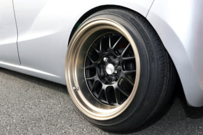なので長距離を走ってのイベント参戦などとなると、ちょっと走っては休んで、とタイヤを冷ましながらの旅路に。それでも新品から1500〜3000㎞も走れば要交換で、スペアタイヤの常時車載は必須。極端な引っ張りタイヤは通常の車両に比べてタイヤ脱落の危険性が高くなるし、そもそもタイヤとフェンダーとのクリアランスがギリギリだったりするから、ノーマル車両であればなんともないような道路上のギャップだって、車高短のクルマには命取りになることもある。