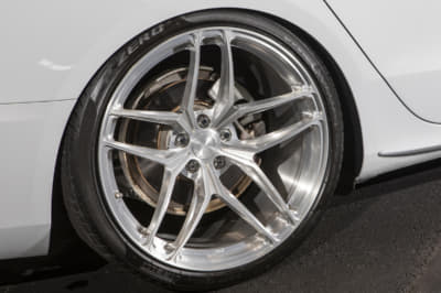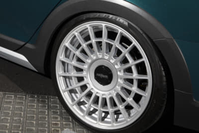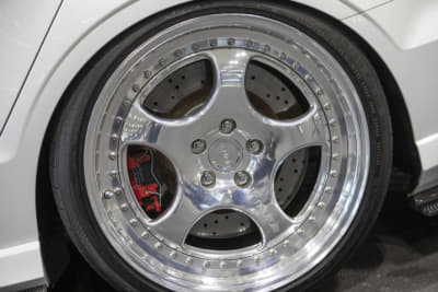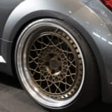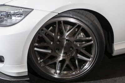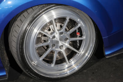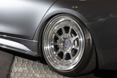 「このホイール、売っています!」というニュートレイルのバリバリ営業マンの古橋サン。「キャストのような鍛造でカドがないのがポイント」というヘリテイジを履き、「スタンス系からハイエンドまでどの方向からでも仕上げられます。すべて鍛造ホイールでワンオフに近いのもポイント!」らしいですヨ。