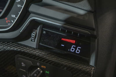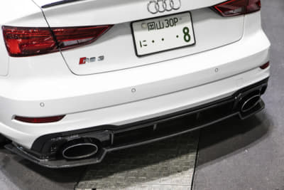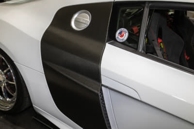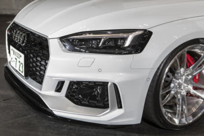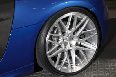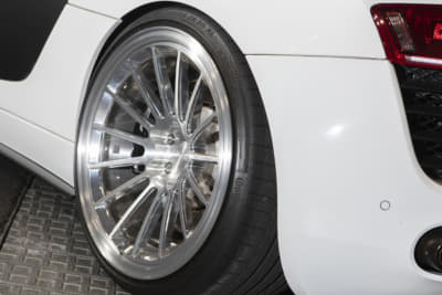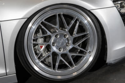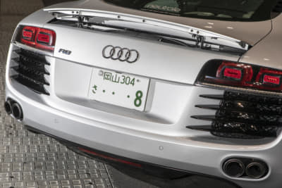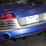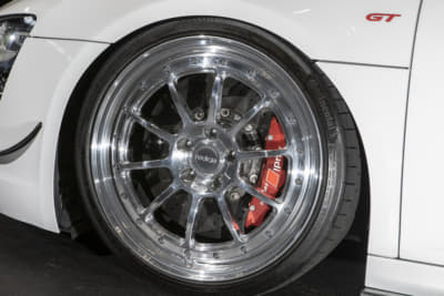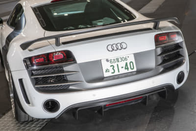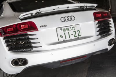 モウフ代表・妹尾サンの個人車でもあるR8。アメリカから部品番号をひろい出して顔面を前期から後期へとフェイスリフト。KWの車高調Ver.4は、R8への装着は「日本にこれ一台」とか。リアディフューザーの隙間から減衰力のハイロー切り替えが行えるスイッチが顔を出しているのもスゴイです!
