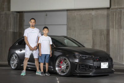 本当はフロントリップも付けたいとの事でしたが、この車高で乗るには「負担が大きいので」と現在は見送り中のオーナー。「全体に大人しめです」とのことですが、いやいやどうして、ブラッシュドティントクリア色のホイール、KWのVer.3とナイスなアイテムをチョイス。娘の萌実サンと。