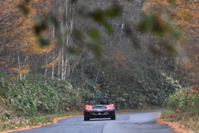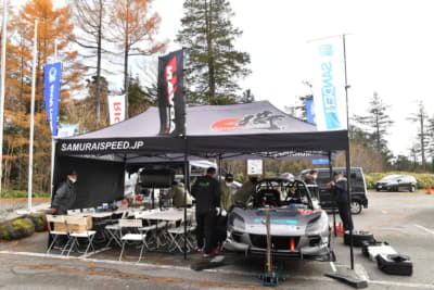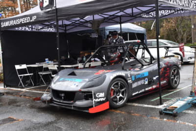開催地となった長野県木曽町はちょうど紅葉の見ごろ、ということもあり、会場に並んだ車両も心なしか鮮やかな印象だ。このシーズン最後の熱い戦いに華を添えるのが、チームSAMURAI SPEEDが持ち込んだピュア電気自動車、GLM トミーカイラZZである。